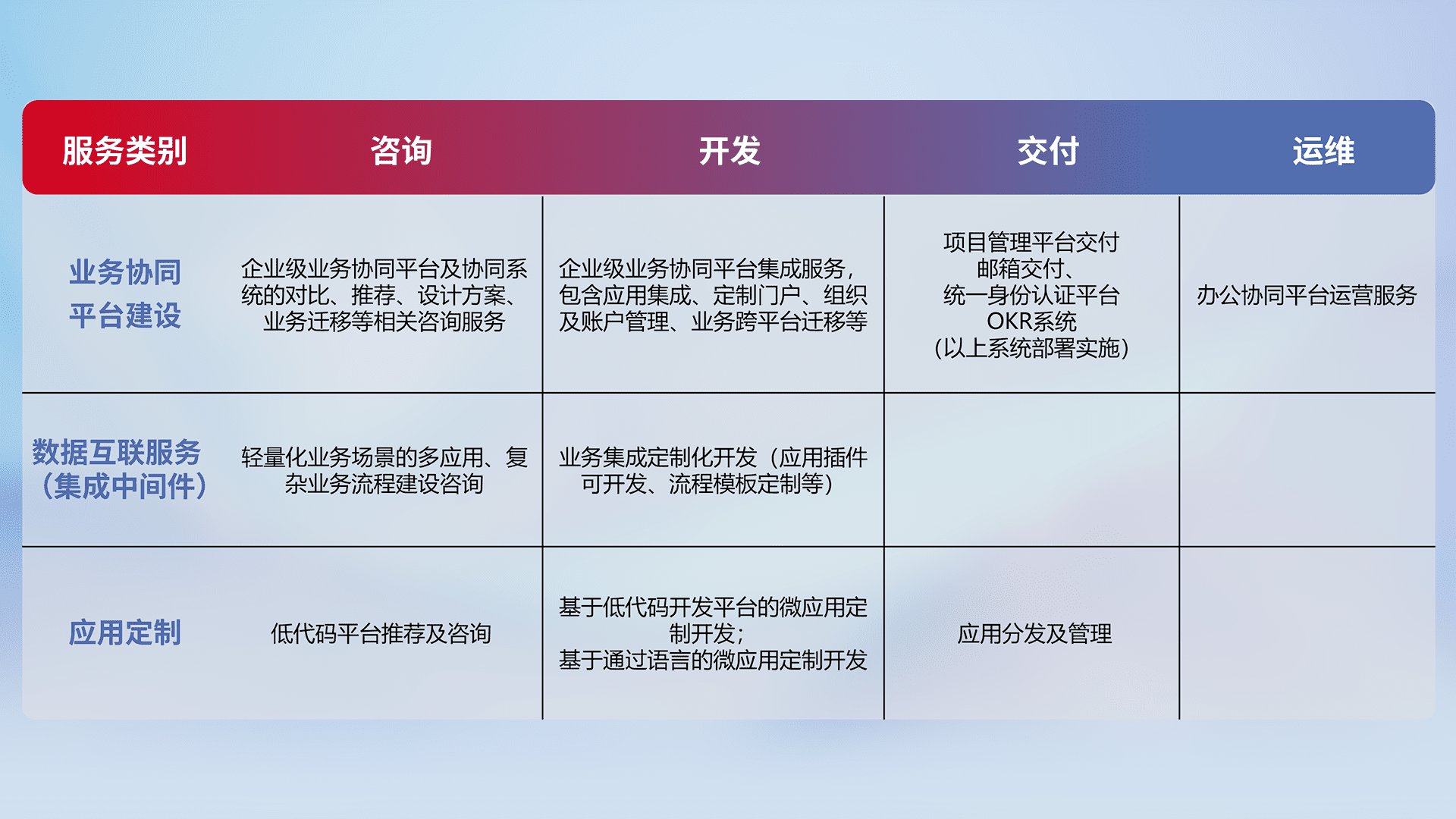 针对钉钉、、企微、、、、IDaas等平台级产品提供产品的规划、、、方案、、交付、、、定制化开发等服务,,实现如统一协同办公、、、、智能客户服务、、混合会议管理、、智能数据查询、、、等业务场景,,实现数字化转型。。。
